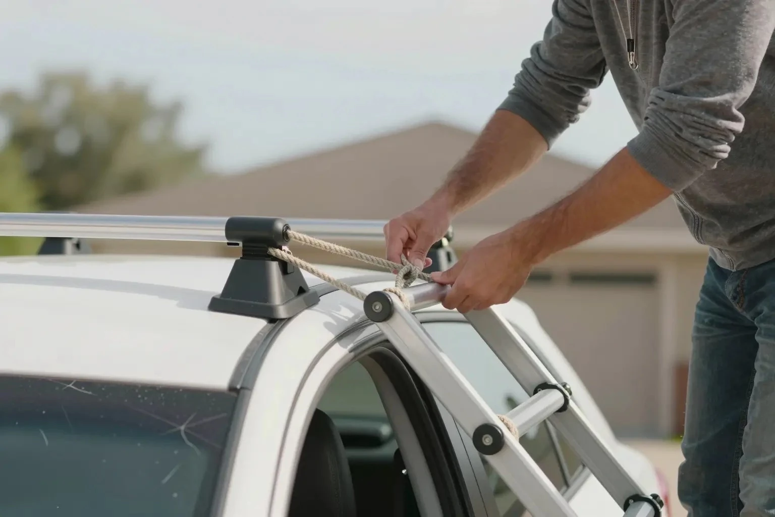 For short distances, temporary solutions like tying the ladder to the top of the car with necessary precautions can be considered. Ensure all securing methods are tight and the ladder is stable before setting off.